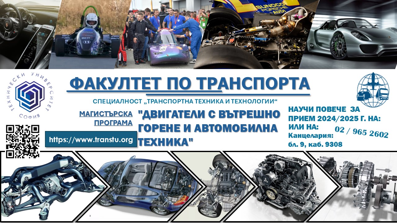![]() Специалност: Транспортна техника и технология Професионално направление: 5.5. Транспорт, корабоплаване и авиация Обучение: Редовно За всички, завършили ОКС /"бакалавър/" и/или /"магистър/" по специалности от област: 5. Технически науки Магистърското обучение се провежда по следните магистърски програми: